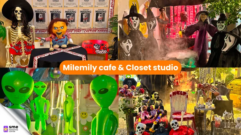 คาเฟ่ที่มีคอนเซ็ปต์น่ารัก ๆ ผสมผสานความเป็นคาเฟ่และสตูดิโอเสื้อผ้าเข้าด้วยกัน ในช่วงฮาโลวีน Milemilycafe&closetstudio มักจะตกแต่งร้านให้มีความสนุกสนานและน่ารักปนหลอนเล็ก ๆ ด้วยพร็อพฮาโลวีนสีสันสดใส และอาจมีคอลเลคชั่นเสื้อผ้าธีมฮาโลวีนให้ได้เลือกชมและถ่ายรูปกันอีกด้วย เหมาะสำหรับคนที่ชอบความคิ้วท์ ๆ ในบรรยากาศฮาโลวีน