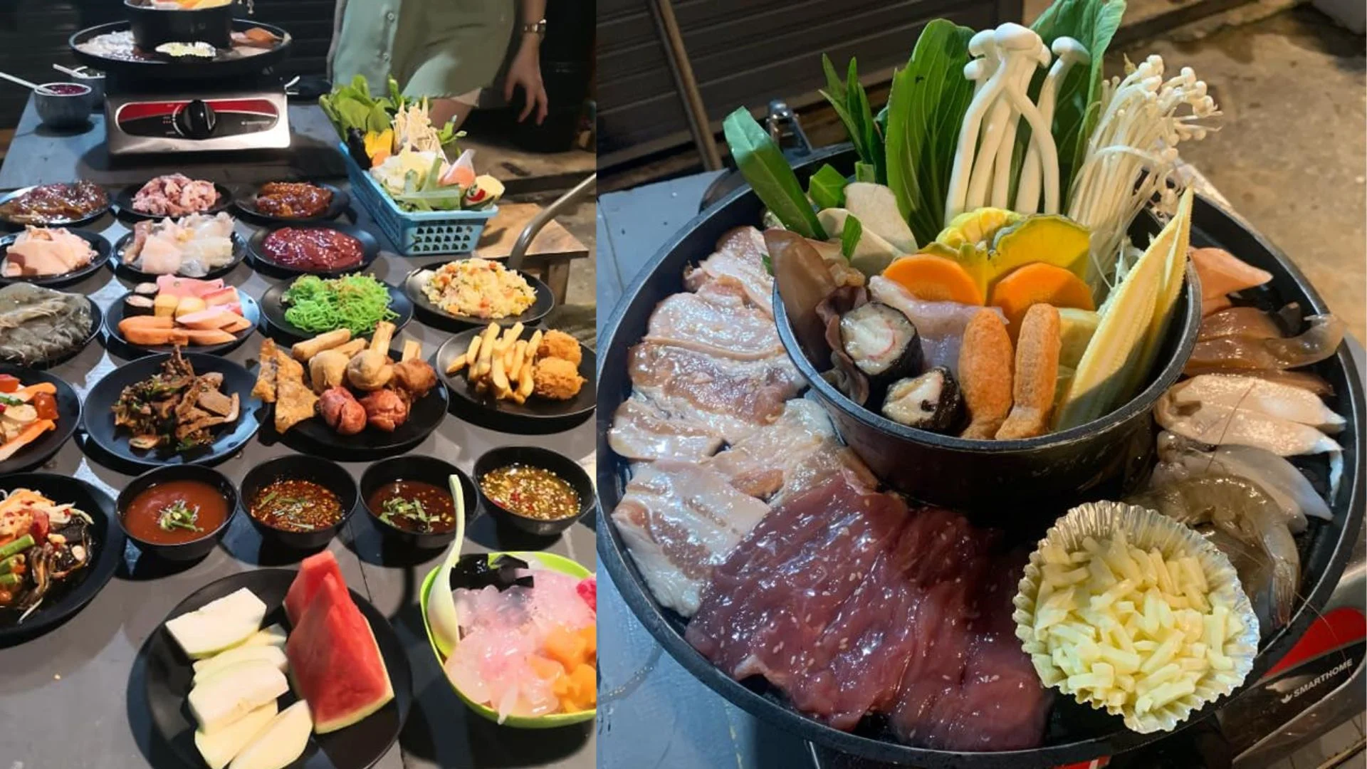 ร้านบุฟเฟ่ต์ชาบูและปิ้งย่างสุดคุ้มย่านท่าข้าม พระราม 2 ที่มาแบบ ชุดใหญ่จัดเต็ม ด้วยเนื้อวัวนอก ริบอาย สไลซ์ เบคอน ซีฟู้ดสด กุ้งแม่น้ำ และหลากผักให้เลือกแบบไม่อั้นในราคาหลักร้อยเท่านั้น โซนน้ำซุปมีให้เลือกหลากหลาย ตั้งแต่ซุปใส ซุปดำ ซุปต้มยำ ซุปหม่าล่า และซุปมิโสะ ให้คุณได้จุ่มหม้อไปพร้อมความแซ่บแบบครบสูตร บรรยากาศร้านกว้างขวาง มีที่จอดรถหน้าร้าน และตั้งอยู่บนถนนท่าข้าม ซอย 23