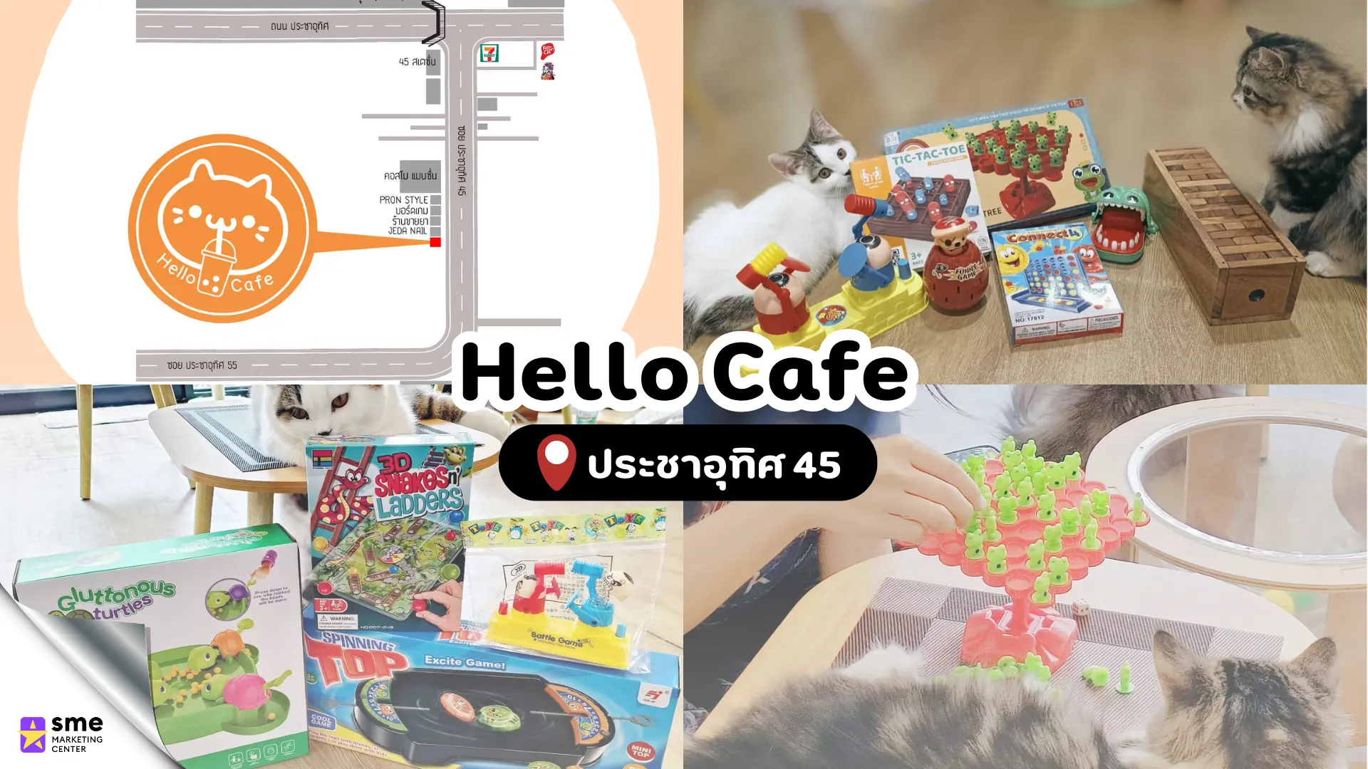 ใครที่รักสัตว์และชอบเล่นเกมห้ามพลาด! Hello Cafe เป็นคาเฟ่สุดน่ารักที่รวมเอา "น้องแมว" มาเป็นเพื่อนเล่นแก้เหงาให้กับทุกคน บรรยากาศภายในร้านอบอุ่นและเป็นกันเองมาก มีมุมให้เล่นกับน้องแมวอย่างใกล้ชิด และที่สำคัญยังมีมุม "บอร์ดเกม" ไว้บริการสำหรับกลุ่มเพื่อนที่อยากเปลี่ยนบรรยากาศมานั่งเล่นเกมพร้อมชมความน่ารักของเหล่าเจ้านาย เป็น ร้านบอร์ดเกม ประชาอุทิศ ที่ให้ความรู้สึกผ่อนคลายขั้นสุด ทั้งได้ฝึกสมองจากเกมกระดานและได้รับพลังบวกจากน้องแมวในที่เดียว