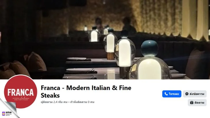 Franca - Modern Italian & Fine Steaks เป็นร้านอาหารอิตาเลียนระดับพรีเมียมที่เน้นสเต๊กและอาหารคุณภาพสูง ร้านอาหารแห่งนี้เหมาะสำหรับการดินเนอร์สุดพิเศษ ลูกค้าที่มาใช้บริการร้านอาหารมักประทับใจกับรสชาติและการจัดจาน